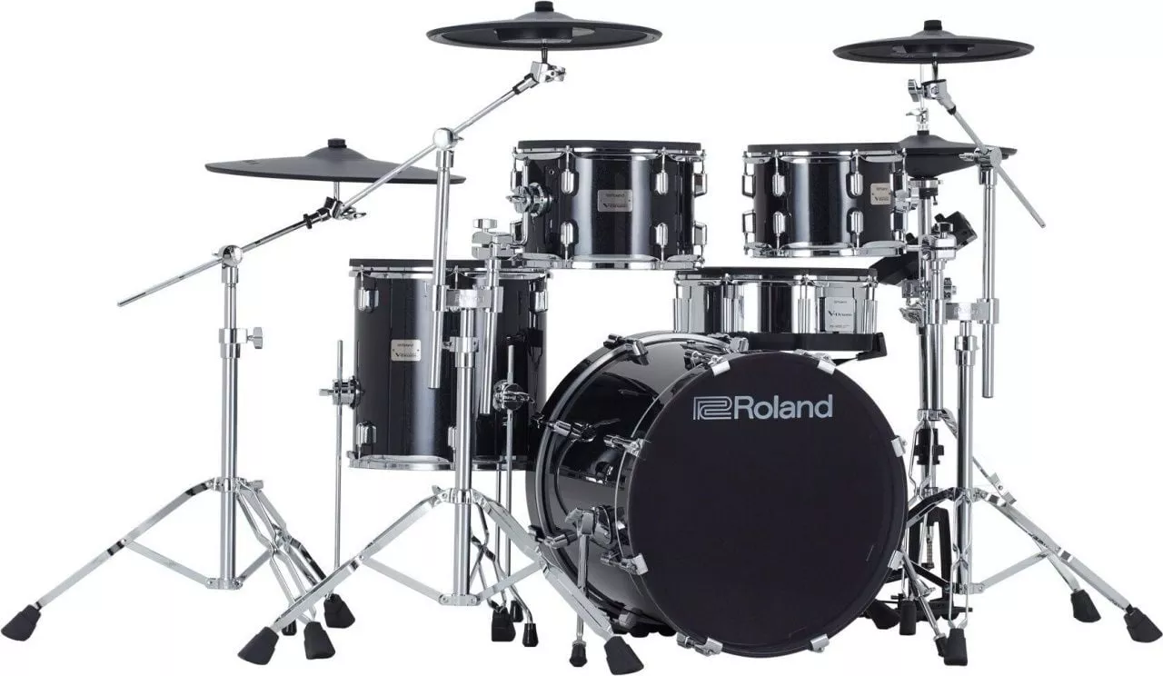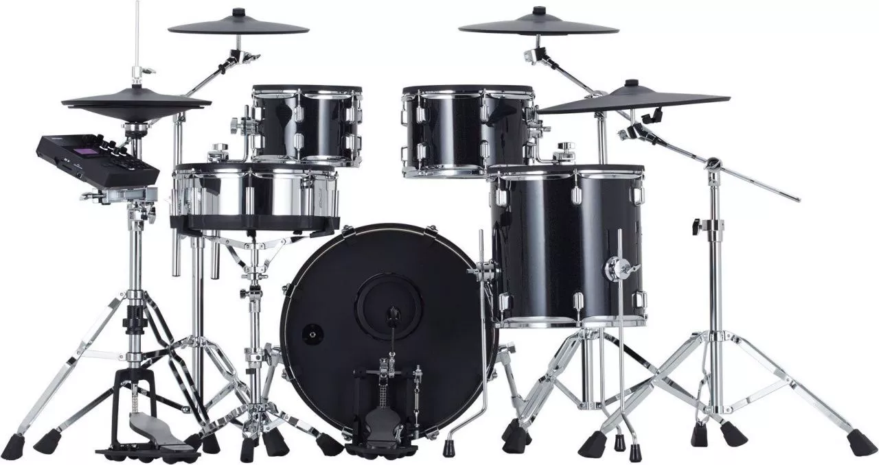 • Установка V-Drums Acoustic Design из пяти частей с полноразмерными деревянными корпусами и модернизированными хромированными стойками с двойными ножками