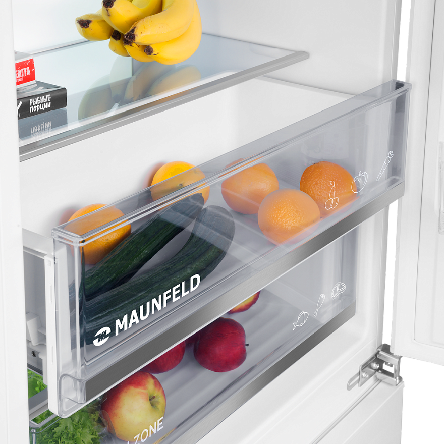 Холодильник Maunfeld MBF19369NFWGR LUX - это современное решение для хранения продуктов в домашних условиях. Прибор обладает двумя камерами и двумя дверями, что обеспечивает удобство использования и возможность организовать оптимальное хранение продуктов. Модель относится к классу энергопотребления A+, что делает ее энергоэффективной и экономичной в использовании. Общий объем холодильника составляет 341 литр, при этом полезный объем составляет 273 литра, что позволяет хранить большое количество продуктов. Объем холодильного отделения составляет 257 литров, а морозильного - 84 литра. Дизайн модели выполнен в белом цвете, что придает ей современный и стильный вид. Фасад изготовлен из эмали, что обеспечивает его долговечность и устойчивость к внешним воздействиям. Внутренняя подсветка осуществляется за счет светодиодного освещения, что делает процесс поиска необходимых продуктов быстрым и удобным.