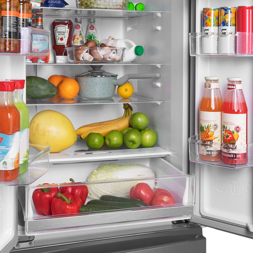 Регулируемые по высоте полки позволяют легко группировать продукты по типу. Организация продуктов внутри холодильника стала ещё удобнее.