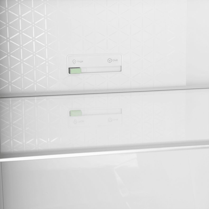 Ящик в холодильном отделении имеет регулировку режимов работы: режим Chill для хранения мяса, птицы или рыбы обеспечивает температуру около 0 градусов, а режим Vege для хранения фруктов и овощей - до 3 градусов.