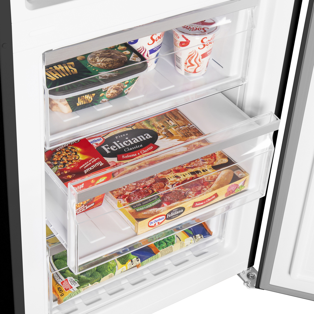 В основе модели — инверторный компрессор, который обеспечивает стабильное охлаждение, долговечность и тихую работу. Уровень шума всего 35 дБ, поэтому MAUNFELD MFF185NFB Inverter уместен даже в кухне-гостиной: техника не отвлекает от отдыха и общения.