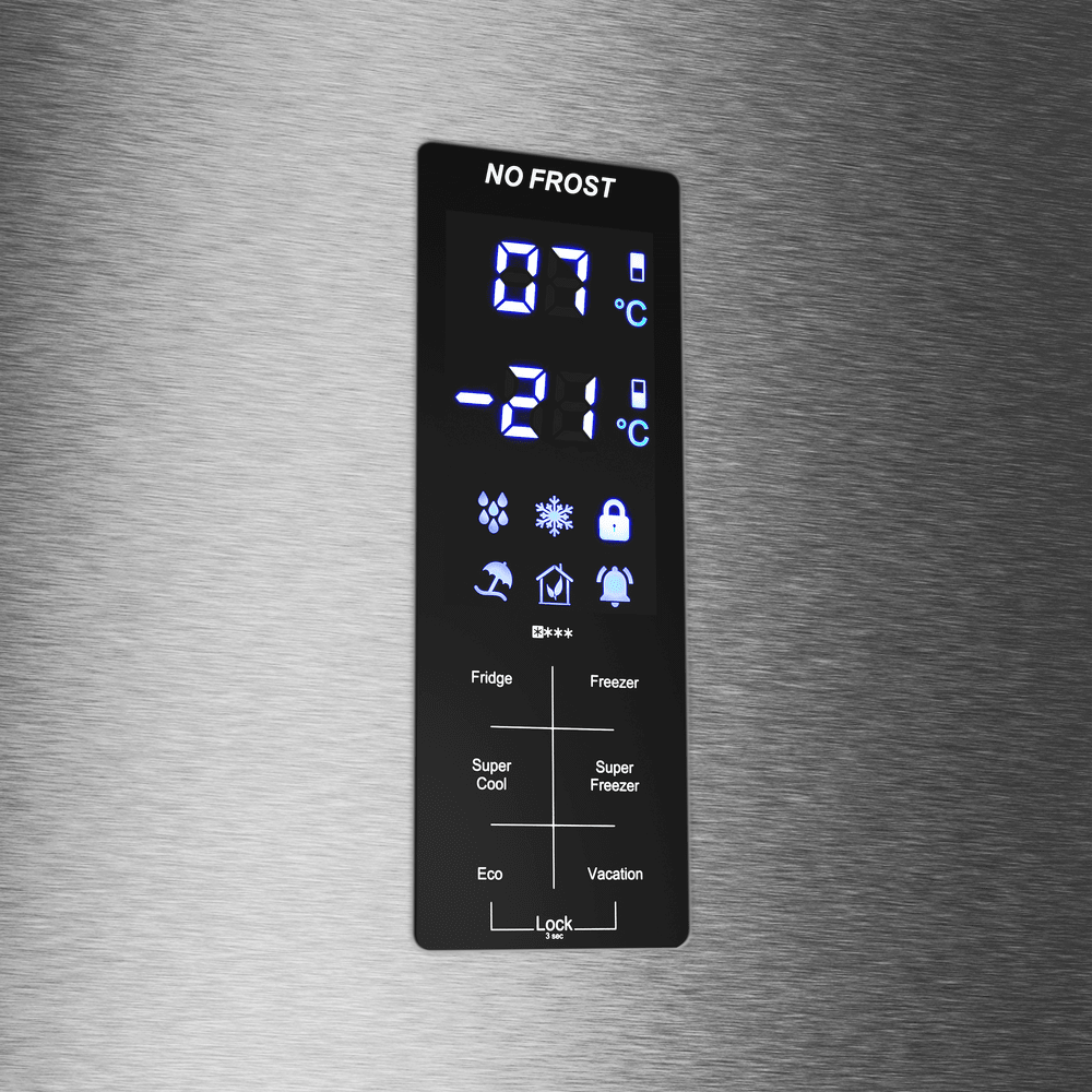 Безопасность и контроль обеспечивают блокировка панели управления и индикатор открытой двери. Возможность перенавешивания двери упрощает установку, а LED-подсветка делает содержимое камер хорошо видимым по всей высоте.