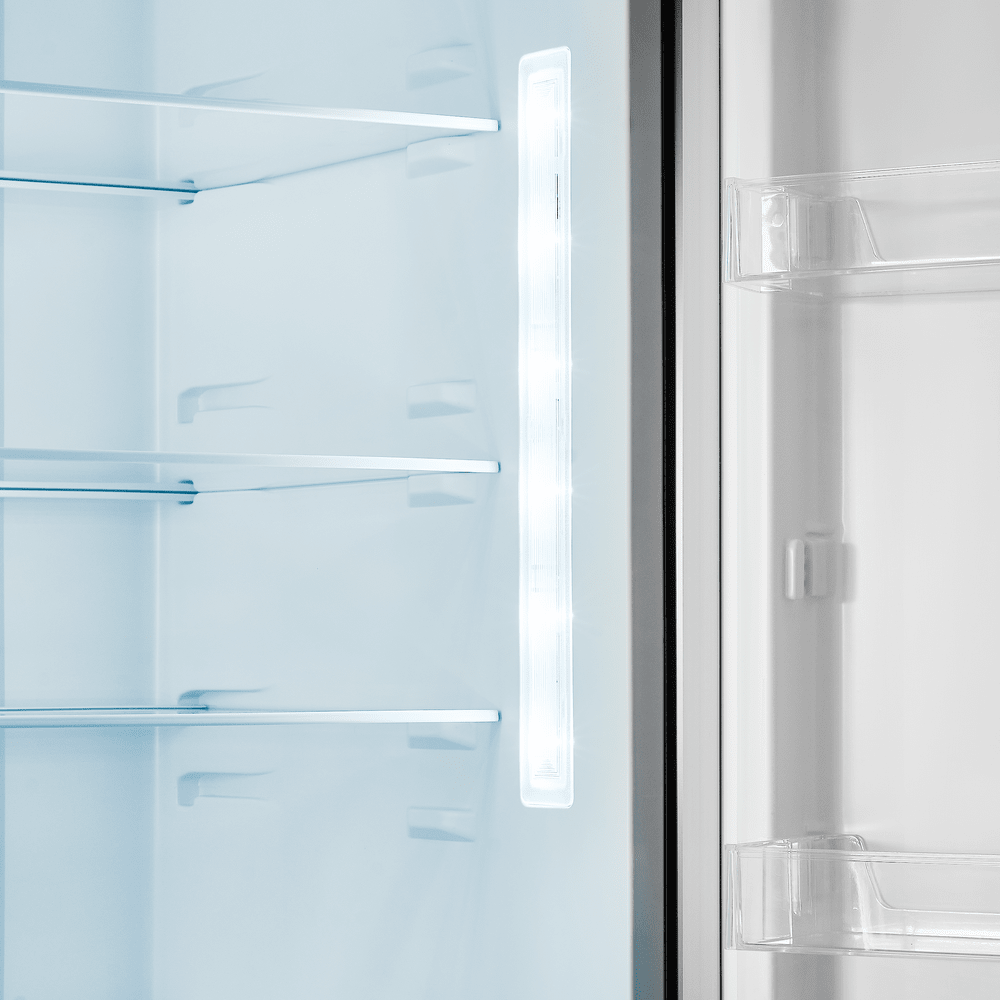 За равномерное распределение холода отвечает динамическое охлаждение: специальный вентилятор поддерживает оптимальные условия на каждой полке и в любом отделении. Внутреннее пространство продумано для гибкой настройки — высота полок и отсеков регулируется, полки выполнены из закаленного стекла, а комплектация включает подставку для яиц и форму для льда.