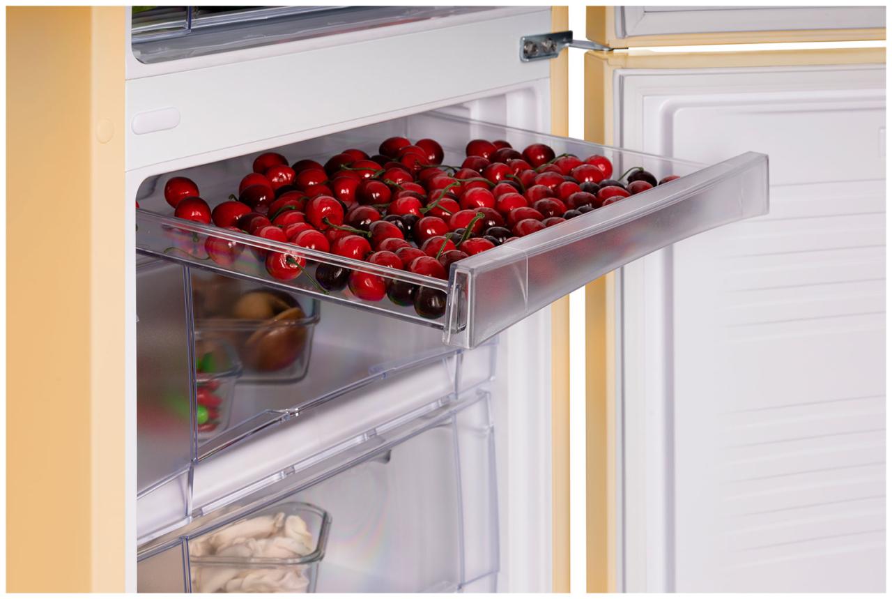 - 3 прозрачных ящика в морозильном отделении позволяют поместить и длительно хранить большие куски мяса, курицу, полуфабрикаты и другие объемные замороженные продукты;