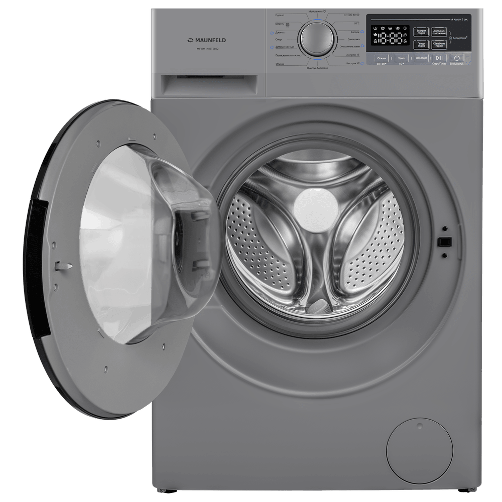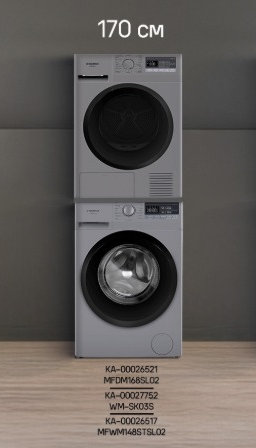 Комплект Maunfeld сочетает стиральную машину MFWM148STSL02, сушильную машину MFDM168SL02 и соединительный элемент WM-SK03S. Решение для полного цикла ухода за бельём и компактного размещения в формате колонны.