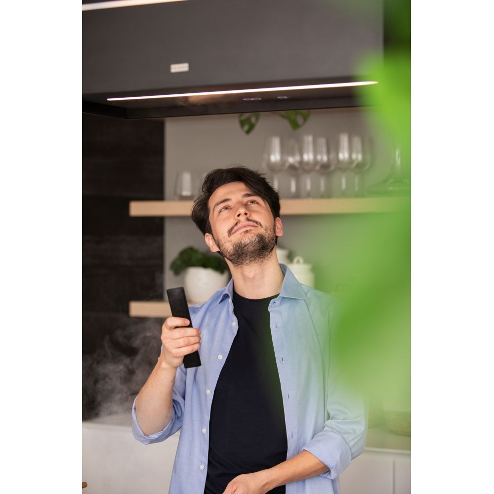 Благодаря технологии K-Link вытяжка синхронизируется с варочной панелью и автоматически подстраивает интенсивность всасывания. Для комфортного освещения рабочей поверхности установлены LED-подсветка и современный модуль освещения, а в комплект уже входят угольный фильтр и пульт дистанционного управления — можно пользоваться сразу «из коробки».