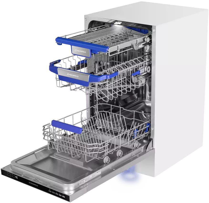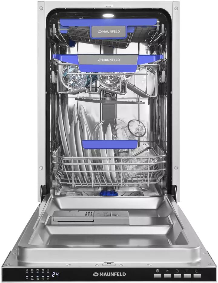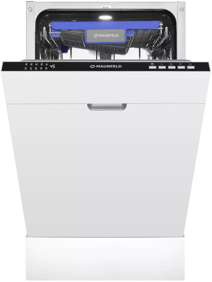 Встраиваемая посудомоечная машина MAUNFELD MLP45230 Light Beam — это узкая, но вместительная модель шириной 45 см (вместо классических 60 см). За раз она может вымыть до 10 комплектов — это оценят в больших семьях, а также те, кто любит готовить и часто принимает гостей.
