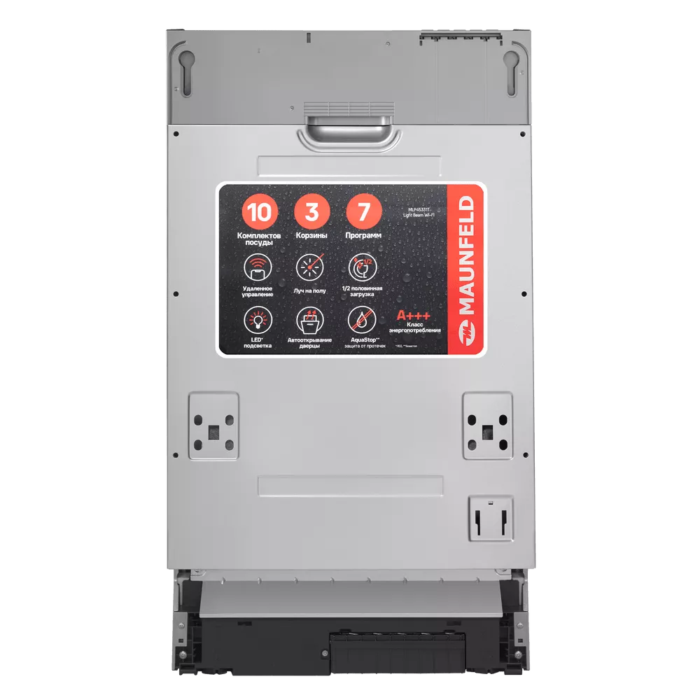 Посудомоечная машина MAUNFELD MLP45331T Light Beam Wi-Fi — удачное решение для кухни, где важно сохранить пространство: узкий формат с ширина 45 см позволяет встроить технику даже в компактный гарнитур без компромиссов по возможностям. При этом модель остаётся по-семейному практичной: вмещает до 10 комплектов посуды — удобно как для ежедневного цикла, так и после приёма гостей.