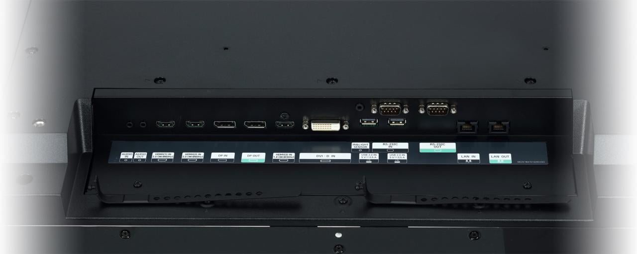 Подключения: 3 x HDMI, DisplayPort и выход, DVI-D, оптический аудиовыход, аудиовыход 3,5 мм, RJ-45 и выход, RS-232C, 2 x USB