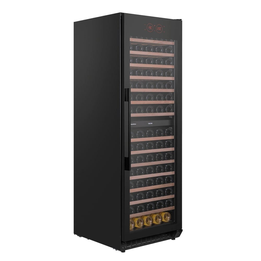 Винный шкаф Maunfeld MBWC-415D171 — встраиваемая модель, выполненная в черном цвете. Вместительность составляет  171 бутылка, а полезный объем равен 415 л. Сенсорное управление позволит легко установить требуемую температуру. Шкаф имеет две зоны, для каждой из них можно задать свой режим охлаждения, что будет полезно для размещения разных сортов вин.